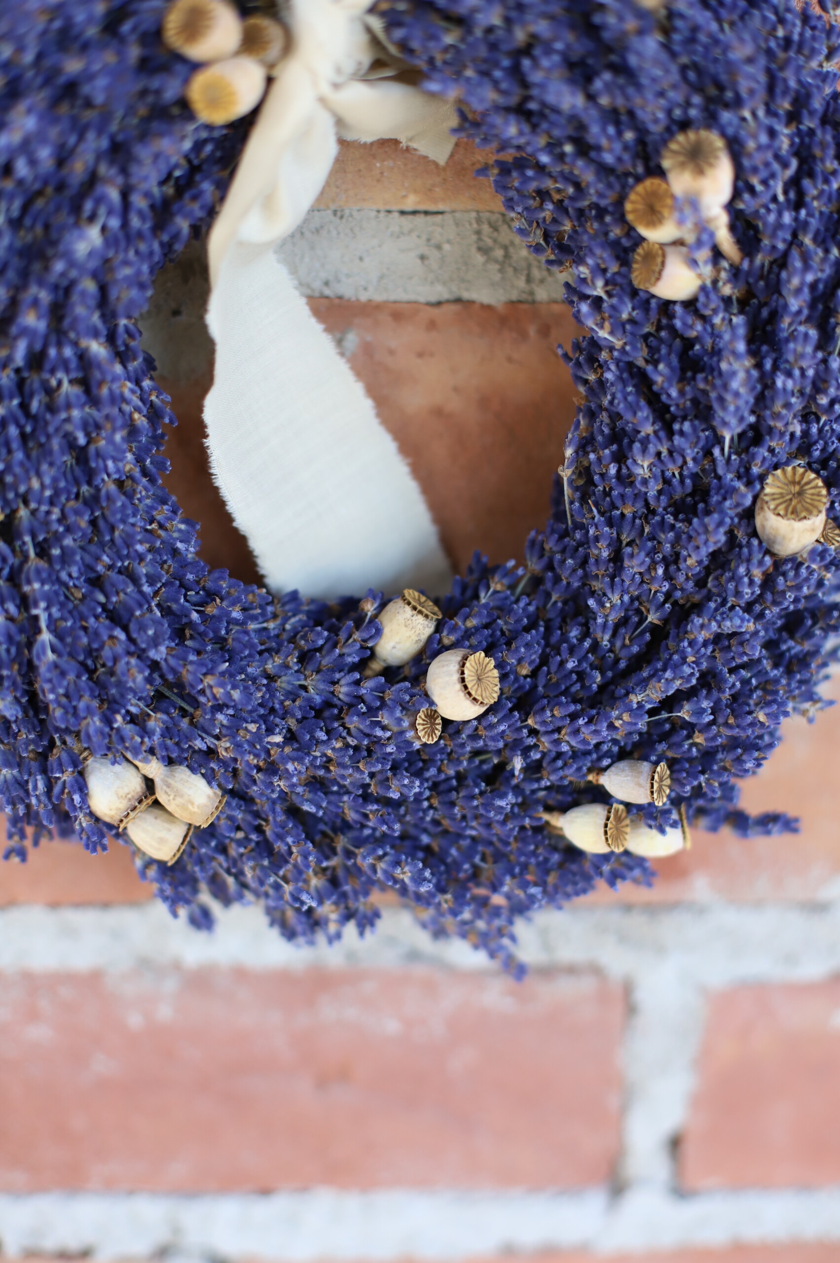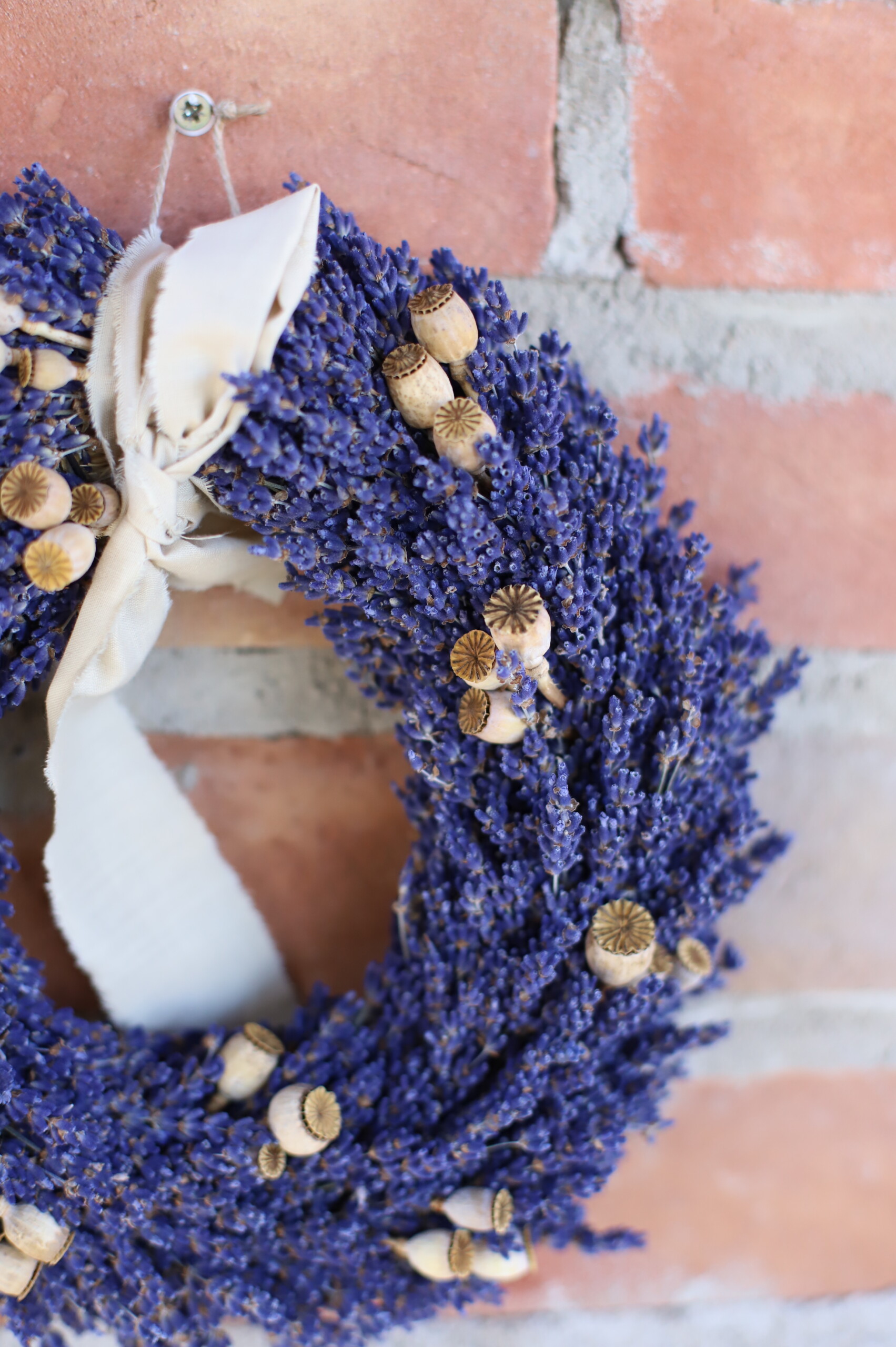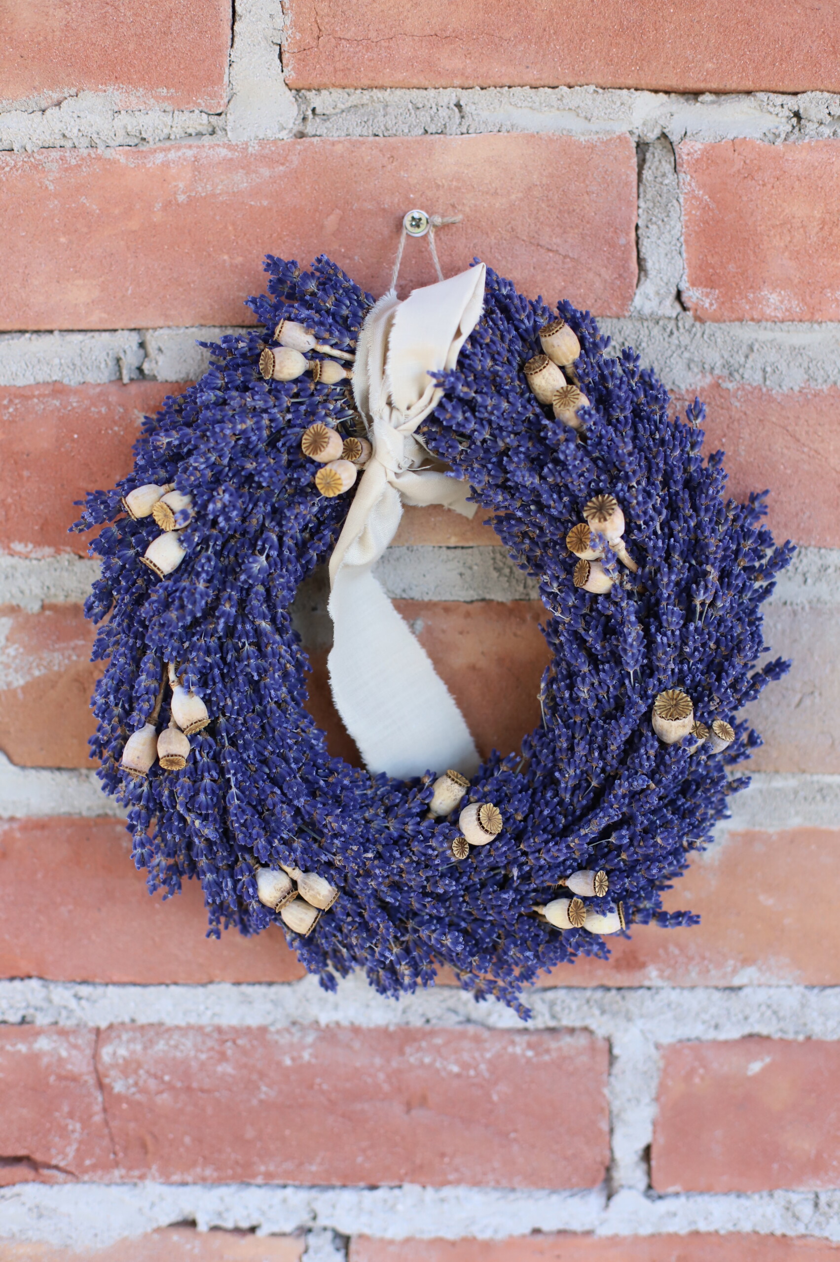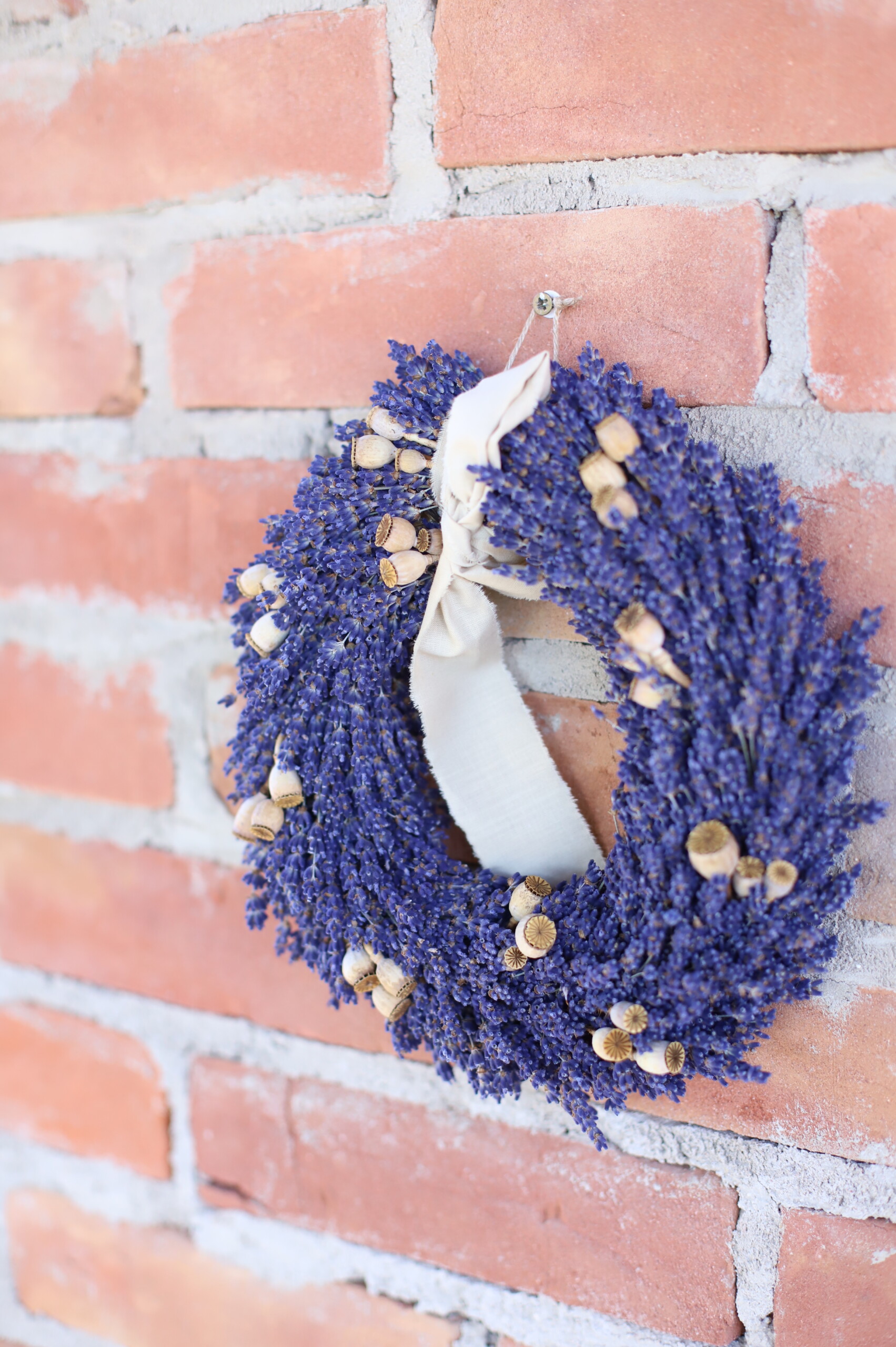 Lawendowy wianek z makówkami to wianek na słomianym podkładzie. Wykonany jest z lawendy Munstead o przepięknym, błękitno-niebieskim kolorze. Lawenda jest ułożona w taki sposób, że wianek będzie wyglądał pięknie zarówno powieszony na ścianie czy drzwiach jak i położony na stole.