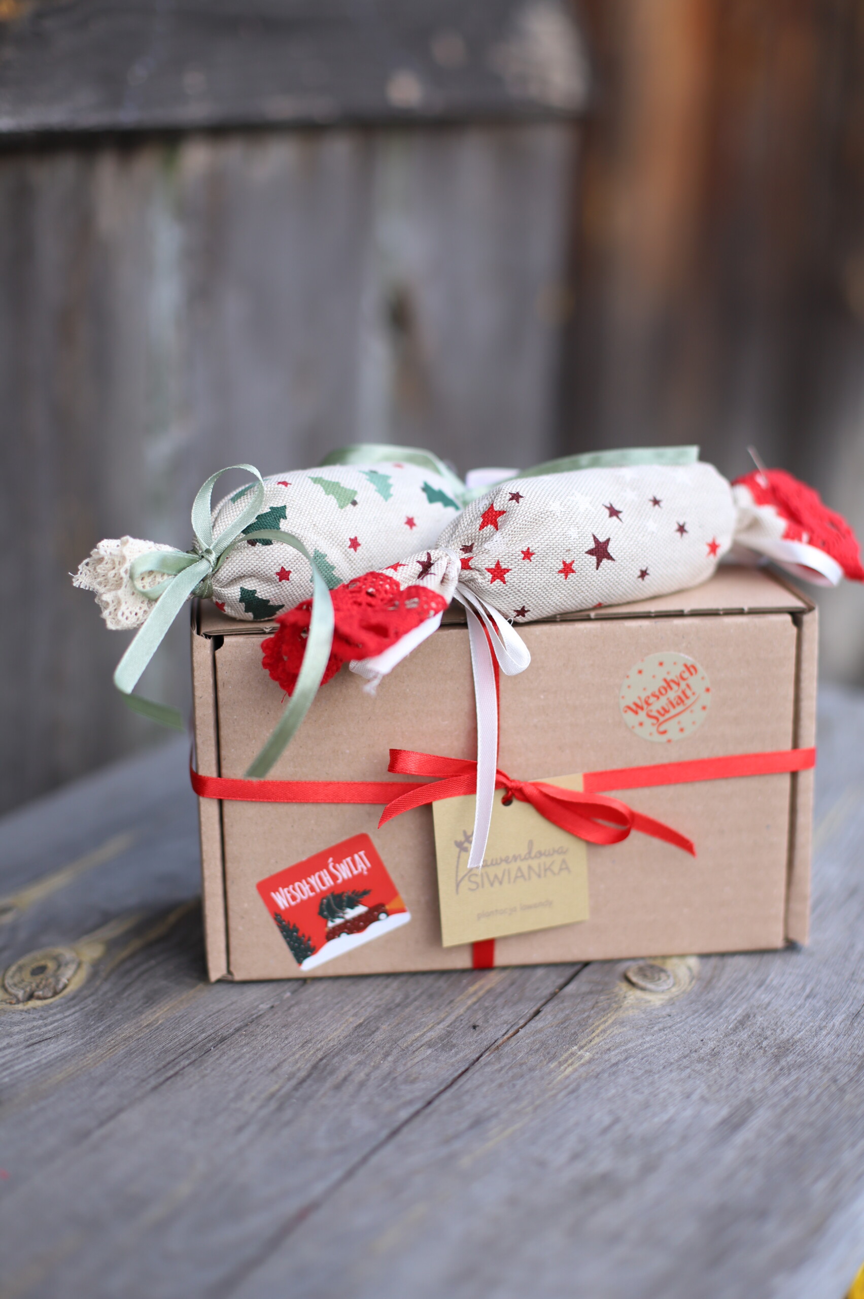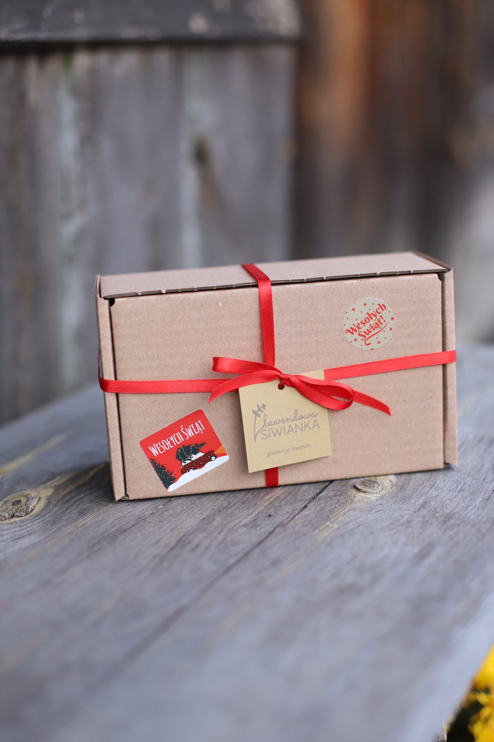Pudełko wypełniamy papierem pakowym i amortyzującą wyściółką papierową, dokładamy gałązkę lawendy. Całość obwiązujemy ozdobną wstążką w kolorze czerwonym i przyczepiamy karteczkę z jednej strony znajduje się nasze logo, z drugiej strony karteczka jest pusta. Na karteczce możemy napisać imię obdarowywanej osoby. Karteczka będzie widoczna bez potrzeby otwierania prezentu. Całość przyozdobiona jest naklejkami w świątecznym klimacie.