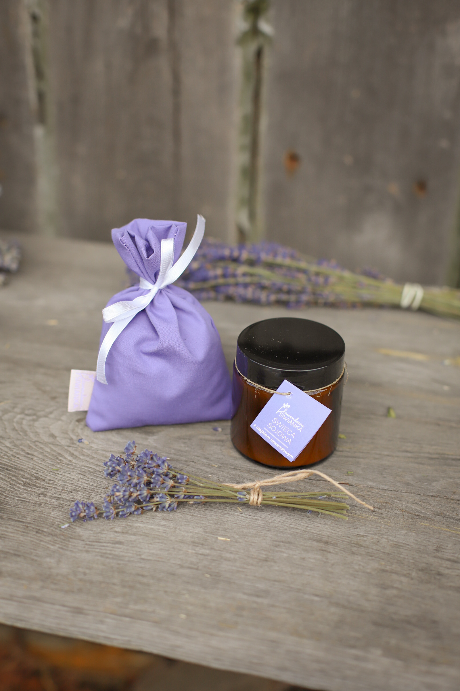 Zestaw o zapachu lawendy zawiera świecę sojową o zapachu lawendowym i fioletowy woreczek zapachowy. Do każdego zestawu dodajemy mały bukiecik lawendy w prezencie.